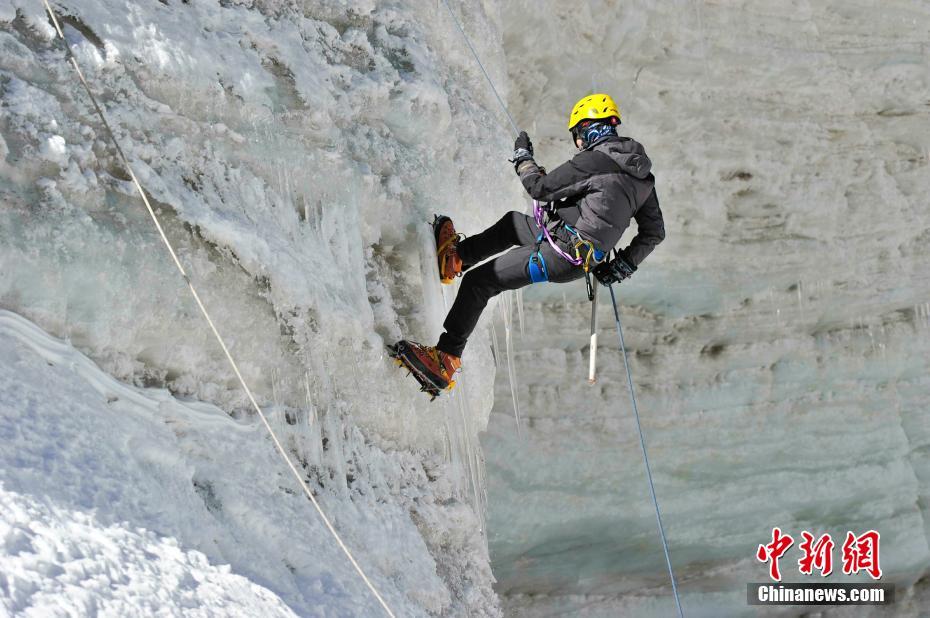 西藏拉薩河谷1號冰川(廓瓊崗日冰川)景區(qū)將與2021年4月正式全面開放,洛堆峰雪山攀登項目也將正式啟動。圖為登山愛好者進行攀登訓(xùn)練。(資料圖片)中新社發(fā) 貢嘎來松 攝