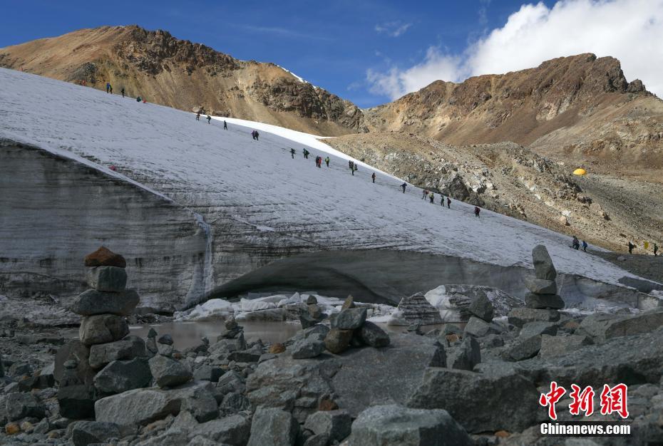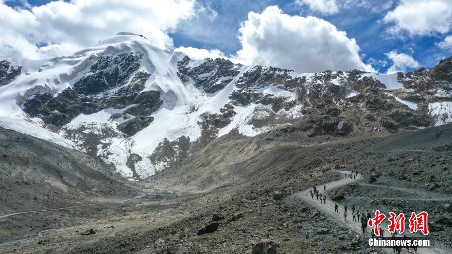 西藏拉薩河谷1號冰川(廓瓊崗日冰川)景區(qū)將與2021年4月正式全面開放,洛堆峰雪山攀登項目也將正式啟動。資料圖為游客在洛堆峰游玩。(無人機拍攝)中新社發(fā) 貢嘎來松 攝