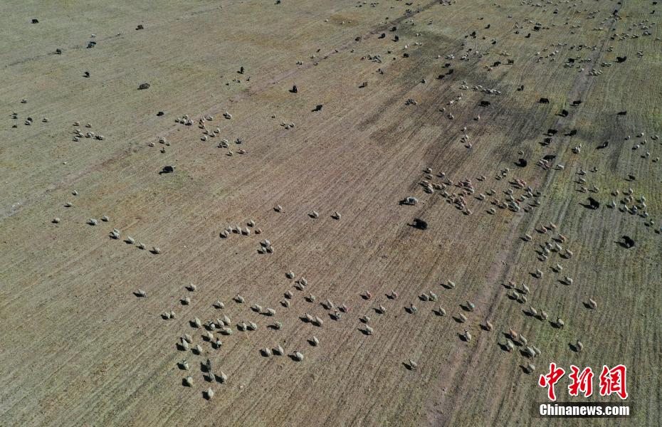 圖為瓊穆崗嘎雪山腳下成群結(jié)隊(duì)的牛羊。(無人機(jī)照片) 貢嘎來松 攝