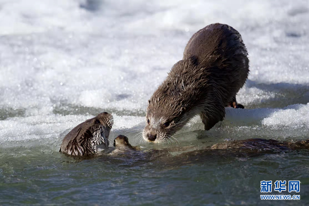 兩只歐亞水獺在扎曲河畔嬉戲。新華網(wǎng)發(fā)(文德 攝)