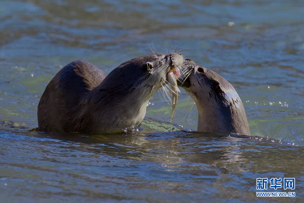 兩只歐亞水獺正在覓食。新華網(wǎng)發(fā)(文德 攝)