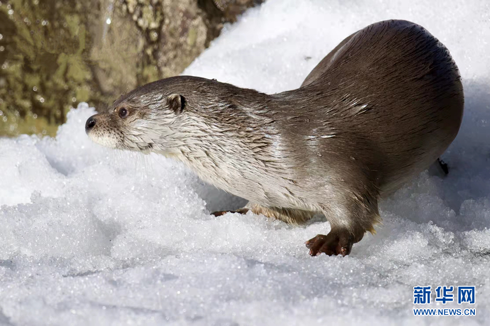 一只歐亞水獺在岸邊嬉戲。新華網(wǎng)發(fā)(文德 攝)