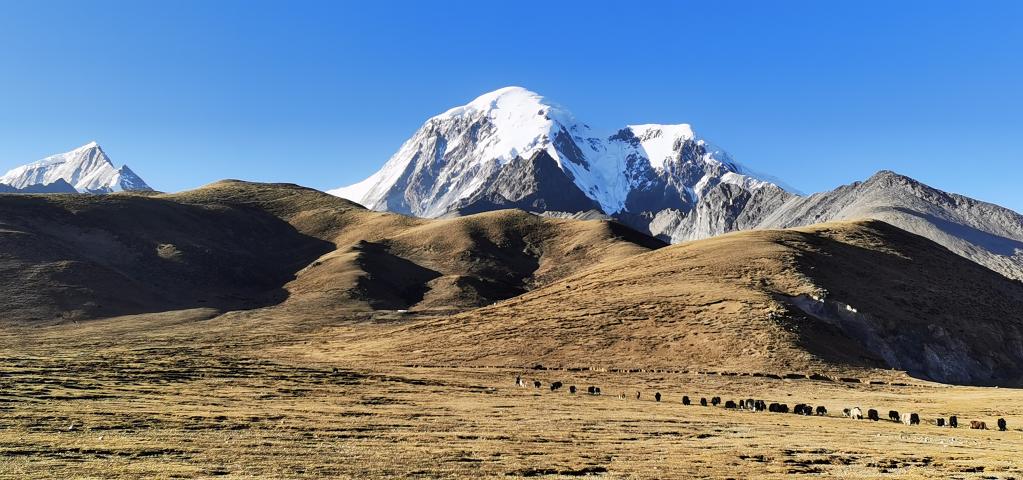 從平緩的草地步入山谷,溪水流下,冰湖上的山峰倒影如夢幻般美麗。目之所及,除了零星經過的巖羊和雪雞,唯有肅穆雄偉的山峰;耳之所聞,除了偶爾傳來的冰川融化的碎裂聲外,只余亙古不變常伴耳畔的風聲。
