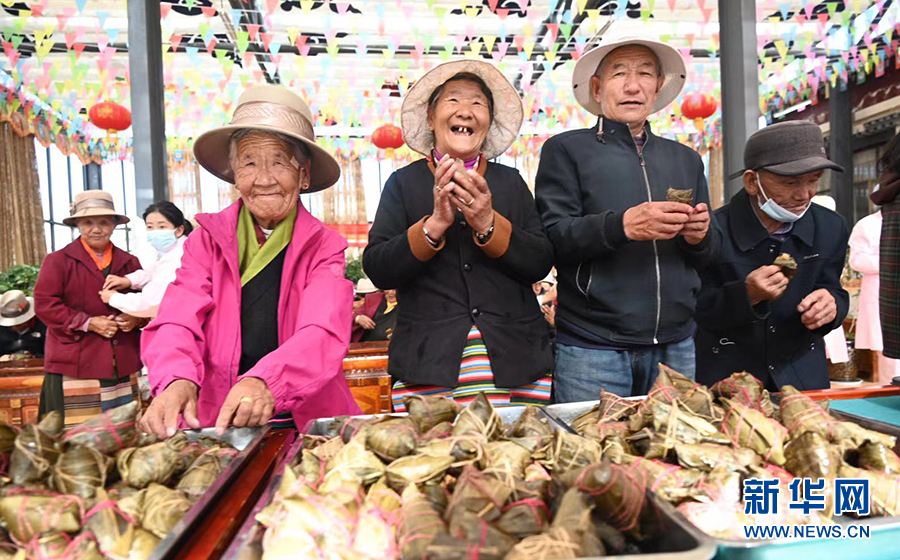6月3日,在西藏山南市集中供養(yǎng)服務中心,老人們品嘗美味的粽子。新華網(wǎng)發(fā)(許國 攝)