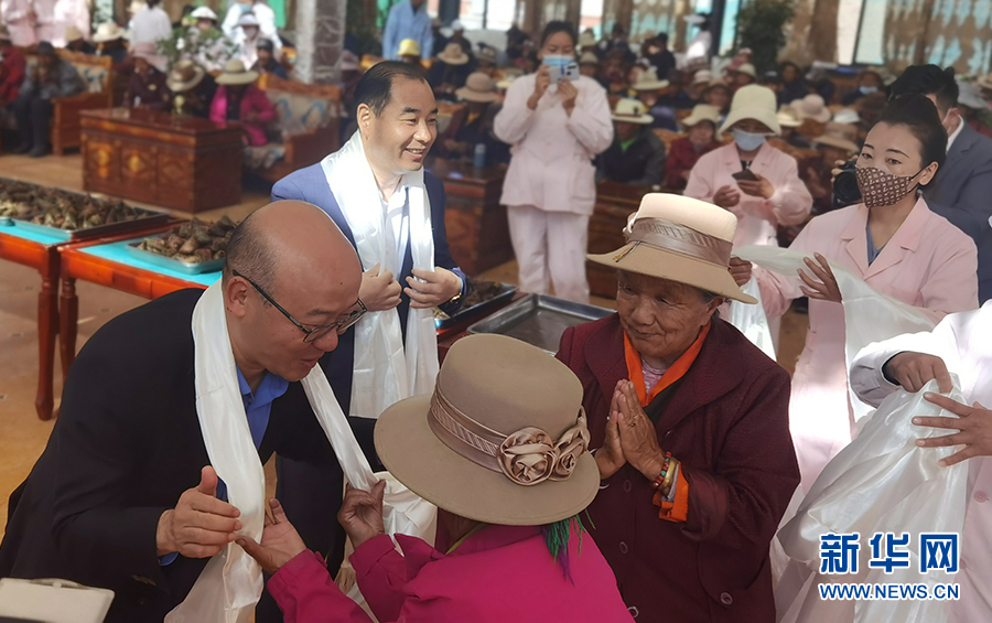 6月3日,西藏山南市集中供養(yǎng)服務中心內(nèi),老人向安徽第七批援藏工作隊的隊員獻上潔白的哈達。新華網(wǎng) 王雷 攝