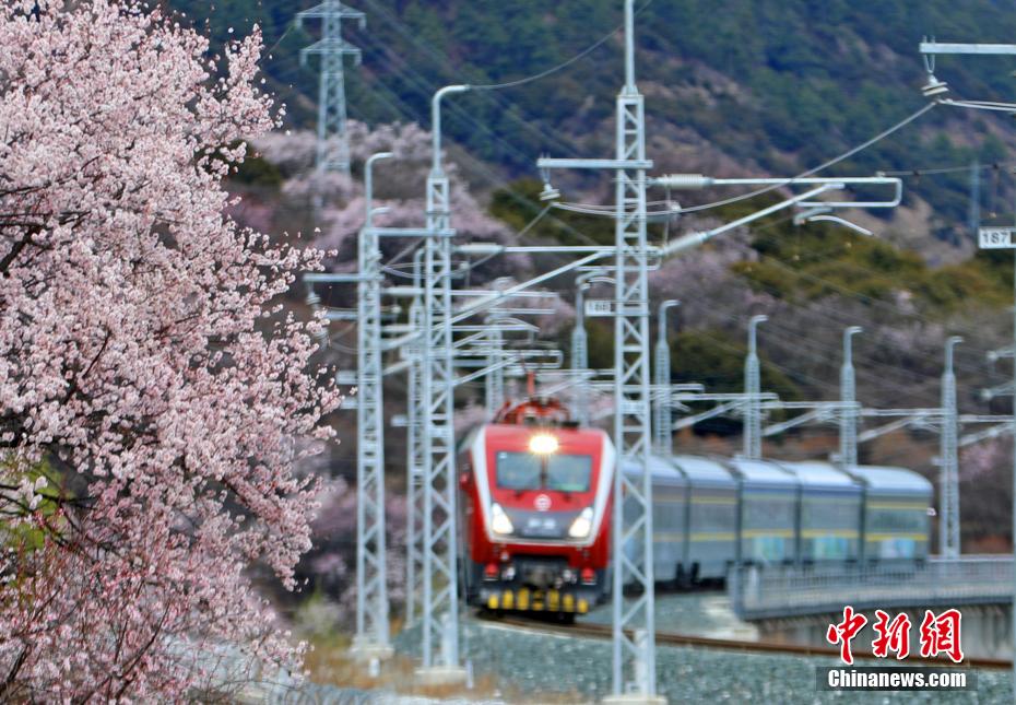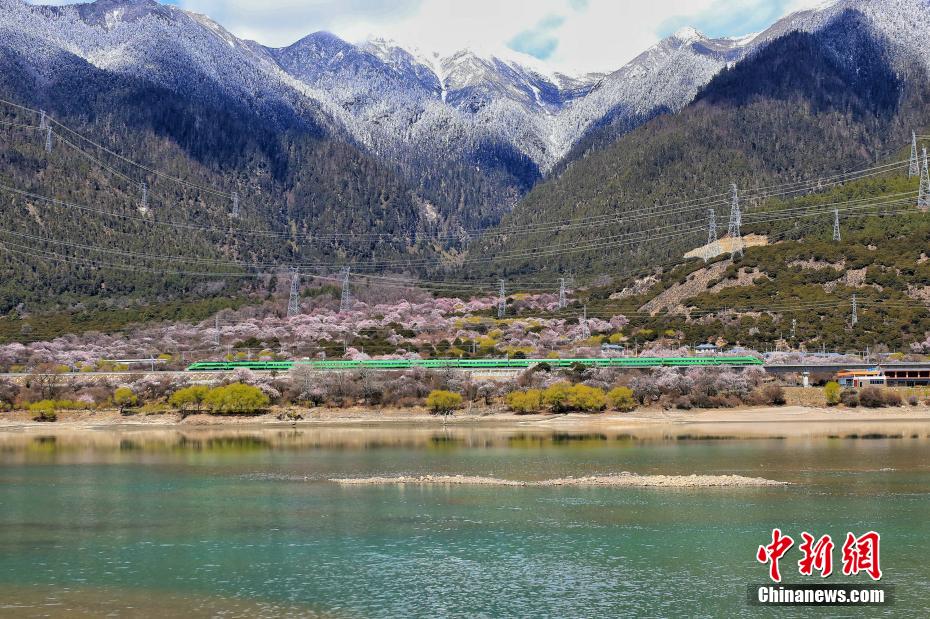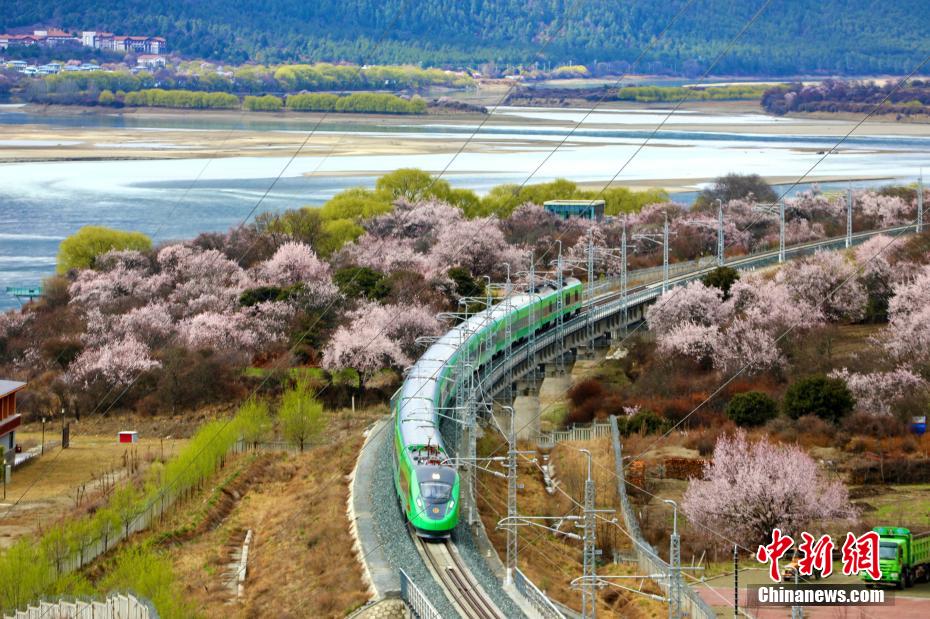 近日,中國鐵路青藏集團(tuán)有限公司介紹,3月下旬至4月,拉林鐵路沿線綿延的野生桃花林盛開,藍(lán)天、白云、桃花、雪山、高原復(fù)興號動車等相互交織,形成了一幅幅美不勝收的畫面。圖為穿梭在桃花林中的拉林鐵路高原復(fù)興號。