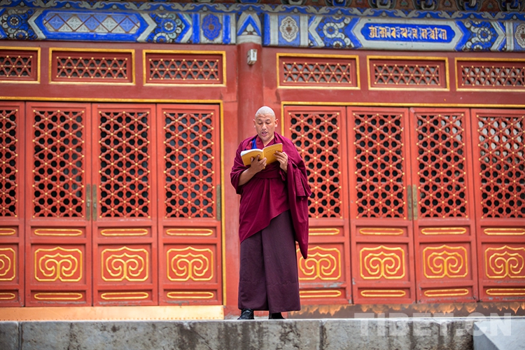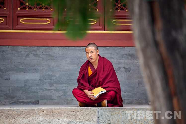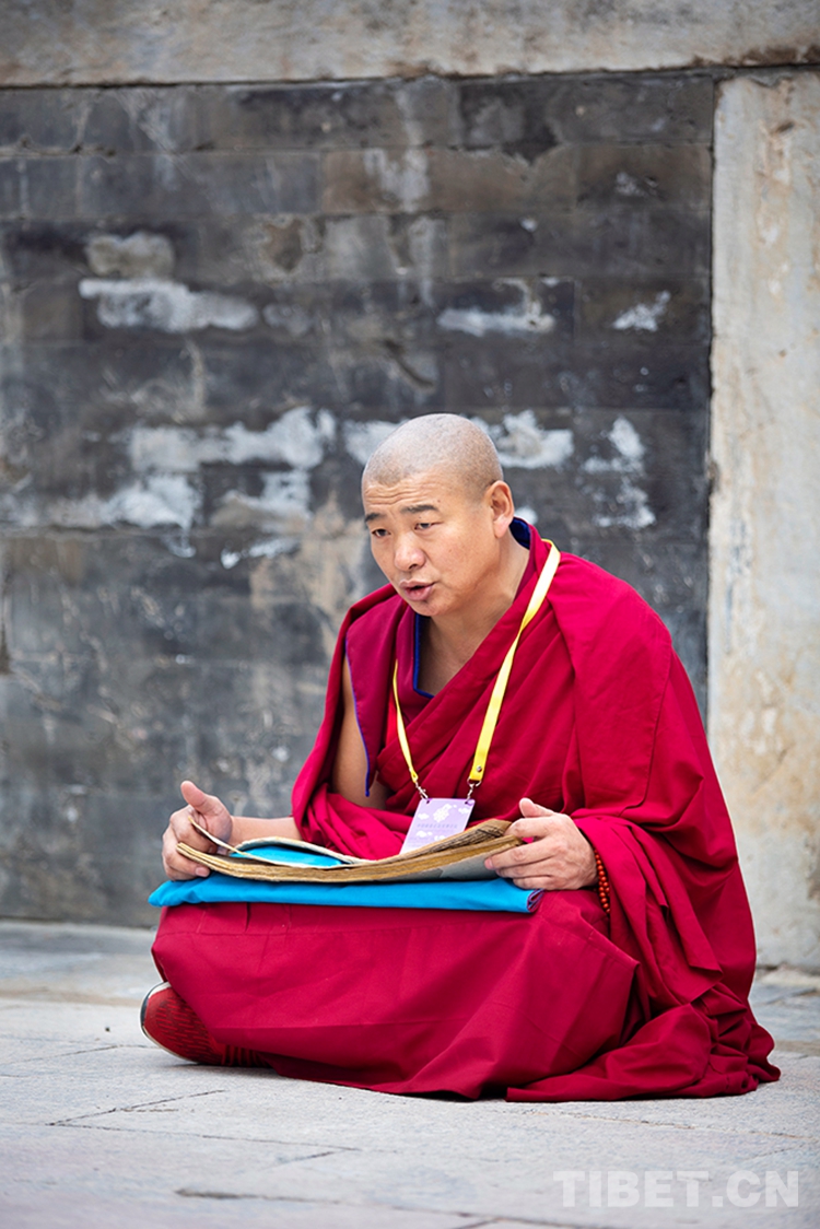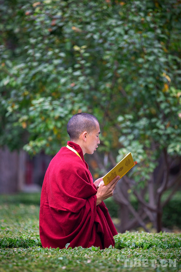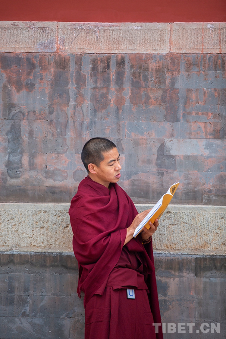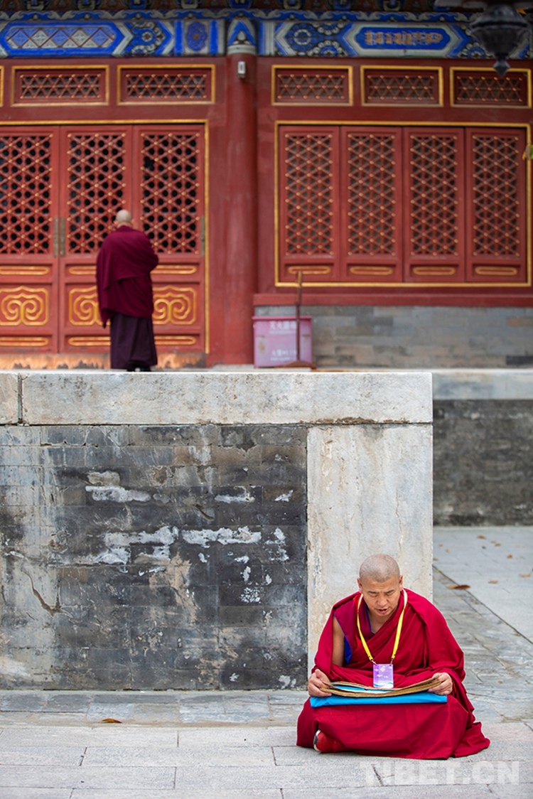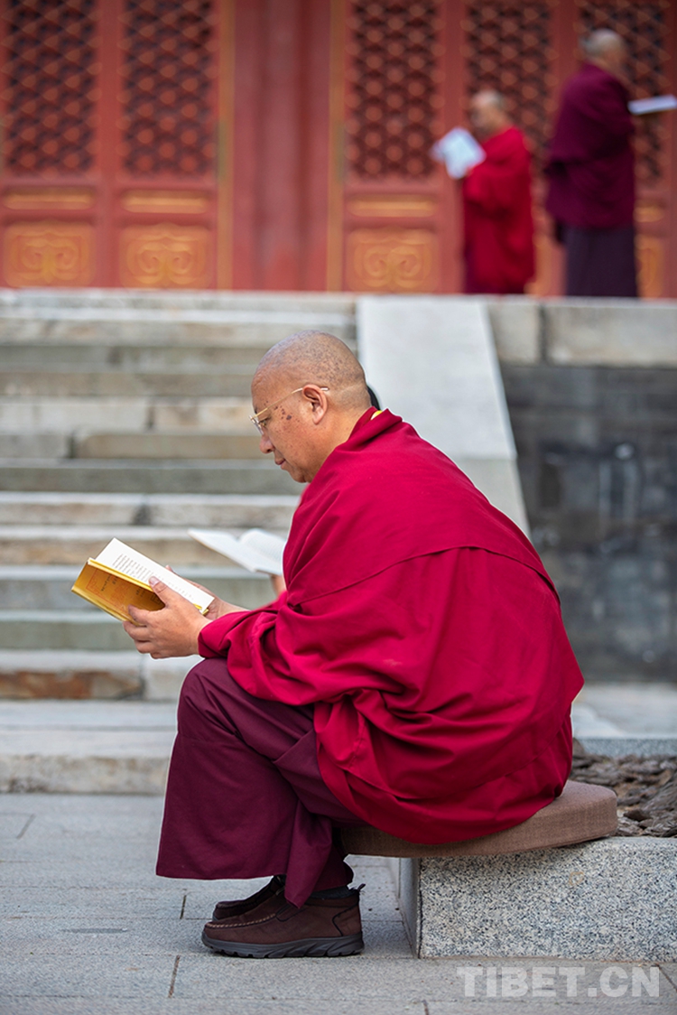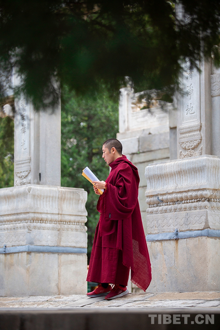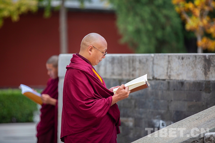 中國西藏網(wǎng)訊 10月29日,深秋的清晨,位于北京西黃寺的中國藏語系高級(jí)佛學(xué)院內(nèi),古柏蒼蒼,清凈肅穆。還有半個(gè)小時(shí),2020年藏傳佛教第十六屆“拓然巴”高級(jí)學(xué)銜畢業(yè)考試辯經(jīng)考試就將準(zhǔn)時(shí)開始。等待參加辯經(jīng)考試的學(xué)僧們,正在西黃寺大殿前誦經(jīng),抓緊時(shí)間為考試進(jìn)行最后的準(zhǔn)備。大家或席地而坐,或立定一隅,或踱步前行,梵唱聲聲,余音繞梁。(中國西藏網(wǎng) 攝影/許娜 編輯/周晶)