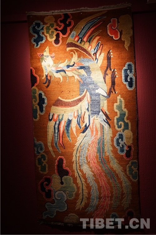 “本次展覽的藏毯,色彩搭配和編織都是技藝一絕,尤其是圖案寓意深遠(yuǎn),最具特色的是龍身鳳尾的龍鳳呈祥花紋非常精美?!苯橛^藝術(shù)中心的創(chuàng)始人徐應(yīng)龍介紹,“上半身為龍身,下半身為鳳尾,體現(xiàn)了多民族的文化交往交流交融?!?/p>