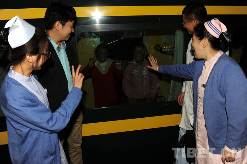 這是北京兒童醫(yī)院醫(yī)生在北京西站為術(shù)后乘火車(chē)返藏的先心病患兒送行告別(唐召明2012年9月28日攝)