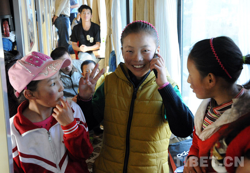 這是乘火車(chē)進(jìn)京治療先心病的患兒卓嘎,在火車(chē)將抵達(dá)北京時(shí),給阿爸打電話(huà)報(bào)平安(唐召明2012年9月18日攝)