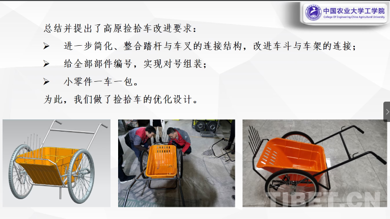 啟動會上,高原撿拾車研發(fā)首席專家中國農(nóng)業(yè)大學工學院教授王光輝介紹了高原撿拾車最新改版的情況。他表示,針對過去推廣中發(fā)現(xiàn)的個別問題,對車子進行了優(yōu)化設計,去掉了易發(fā)生損壞的控叉線閘,調(diào)整了車身的踏桿與車叉的連接結(jié)構(gòu),改進車斗與車架的連接,做到了對號組裝和小零件一車一包等,使安裝更加便捷、使用更加方便、車子更加堅固。