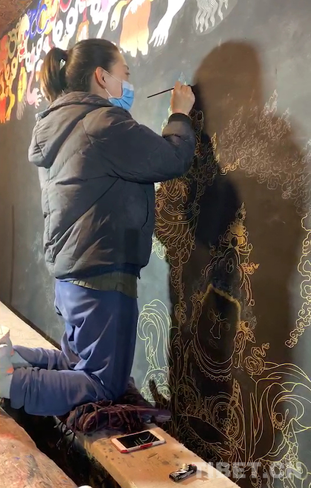圖為尼瑪倉拉在寺廟修復(fù)壁畫 圖片由受訪者提供