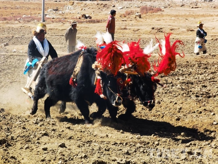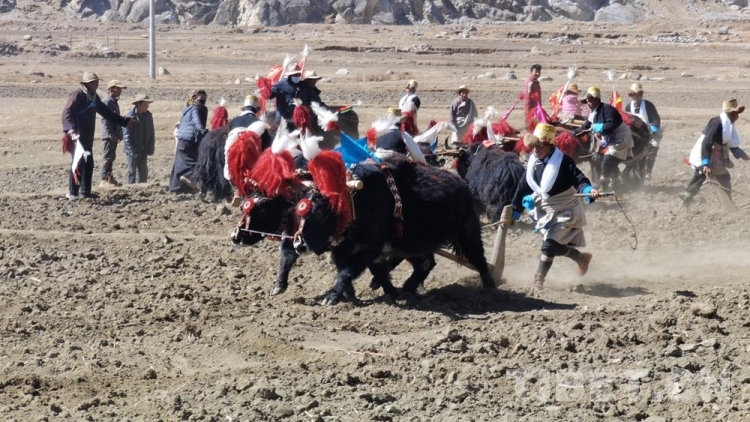 在日喀則市南木林縣嘎布村,鄉(xiāng)野間鈴鐺聲響個不停。梳洗毛發(fā)、掛上紅色的穗子,拿出犁頭、喂牛吃糌粑……春耕儀式即將開始,“二牛抬杠”的傳統(tǒng)依舊在這里保存。手持鞭子,身著盛裝的男子在地里驅趕著兩頭耕牛向前奔跑,翻出的泥土揚起陣陣塵土。吆喝聲伴著鈴鐺聲,還有周圍的歡笑聲,讓這里異常熱鬧。