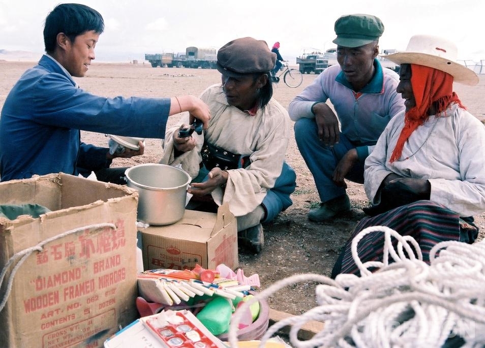 圖為在文部辦事處(現(xiàn)改為尼瑪縣)賽馬會(huì)上,如“候鳥”一樣飛來飛去的漢族商販在經(jīng)營(yíng)小商品(唐召明1987年攝)