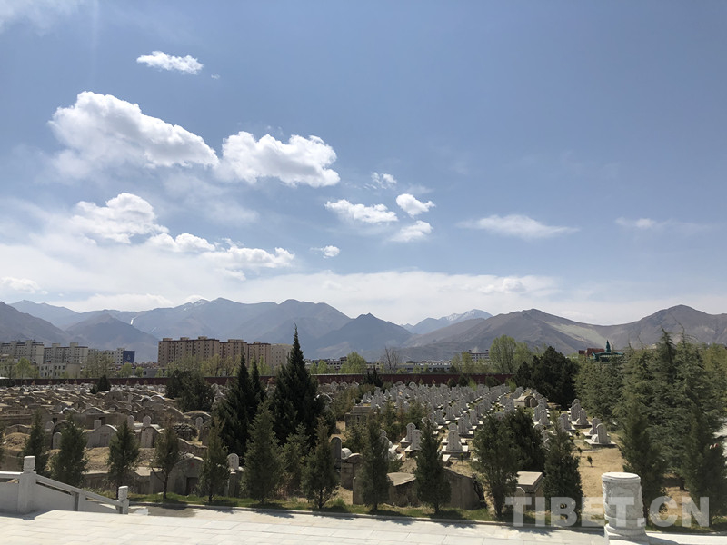 一到陵園,大門口一幅“為有犧牲多壯志、敢教日月?lián)Q新天”的對聯(lián),也讓我們此次祭奠活動突然有了一種特別的精神支撐,我感覺這句話放在西藏這個地方最合適,但暫時說不出為什么。我們登記以后,緩步走進陵園。整個陵園正前方一大片寬闊的廣場,題有“革命烈士永垂不朽”漢藏兩種文字的紀念碑,默默地矗立在廣場中央,碑的左右兩邊各立著一面一人高的國旗和黨旗?;◢徥伾木薮蠹o念碑和肅穆的廣場,映襯著鮮艷的國旗和黨旗,背后是圍繞著墨綠松柏和剛剛發(fā)芽唐柳的烈士墓地,更遠處是拉薩河谷的壯闊群山和高原湛藍的天空,風從這之間吹過,似乎在訴說著這片土地上發(fā)生的故事和長眠此處烈士們經(jīng)歷過的波瀾壯闊。我們?nèi)〕龌ㄊ凸_,獻至紀念碑,并肅穆感懷革命烈士的英勇壯烈和無私奉獻,最后用三鞠躬表達我們對先烈的緬懷和致敬。