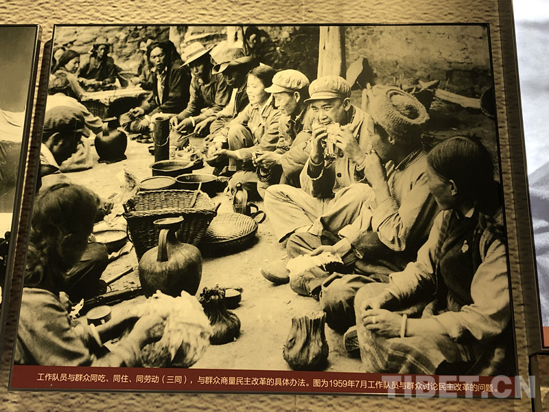 圖為西藏民主改革時工作隊員與群眾同吃、同住、同勞動。圖片源自拉薩烈士紀念館
