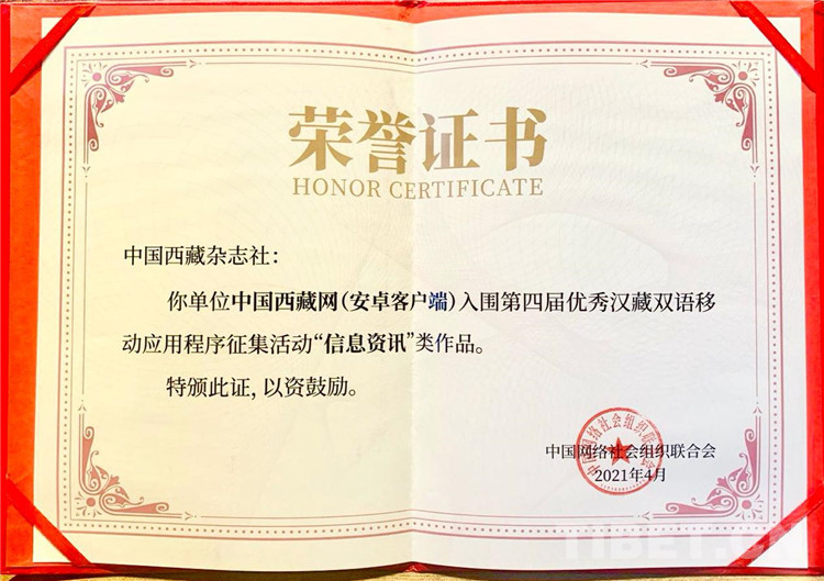 圖為中國(guó)西藏網(wǎng)的獲獎(jiǎng)榮譽(yù)證書(shū)