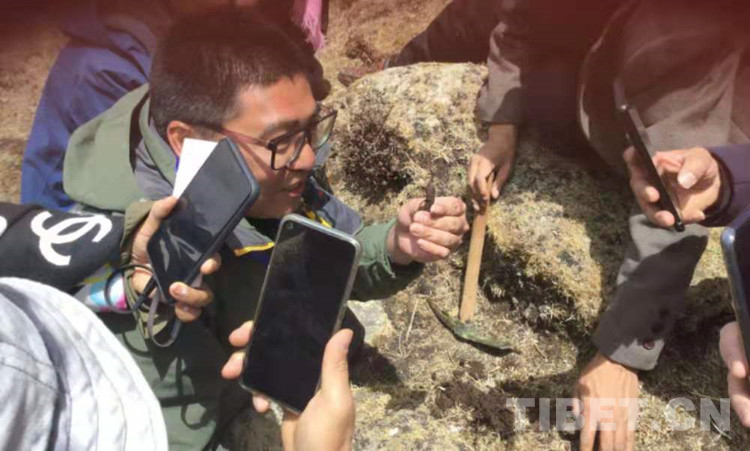 為了親身體驗(yàn)采挖蟲(chóng)草的過(guò)程,當(dāng)天下午,參加文化節(jié)的游客進(jìn)入蟲(chóng)草山,學(xué)著村民趴在山坡上匍匐前進(jìn),尋找冬蟲(chóng)夏草。