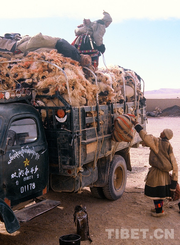 這是西藏那曲地區(qū)(現(xiàn)那曲市)班戈縣對(duì)達(dá)鄉(xiāng)牧民包租汽車(chē)向國(guó)家交售羊毛(唐召明1987年攝)