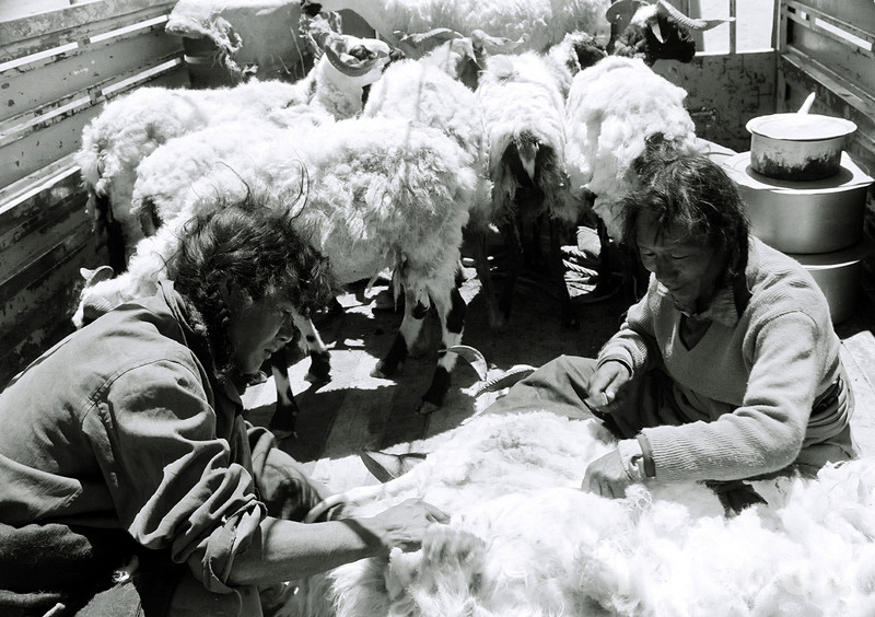 這是尼瑪縣牧民在所包租的卡車(chē)車(chē)廂里用刀在“割”羊毛(唐召明1987年攝)