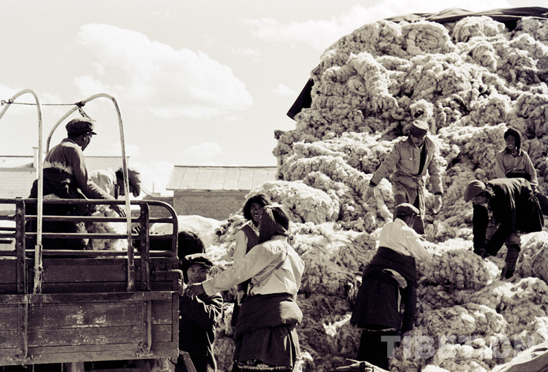 這是藏北雙湖辦事處(現(xiàn)雙湖縣)和平鄉(xiāng)牧民正在裝車(chē)外運(yùn)交售的畜產(chǎn)品(唐召明1987年攝)