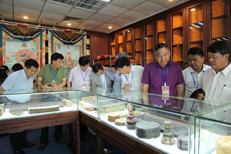 圖為與會的諸位嘉賓在喜馬拉雅文庫考察、觀摩了藏醫(yī)藥古籍文獻(xiàn)