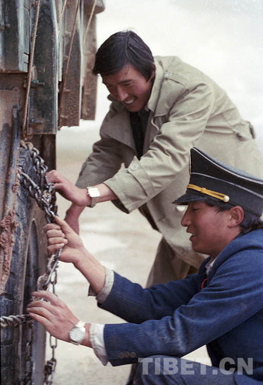 這是郵政人員正在為郵車的輪胎綁防滑鏈條,以便郵車順利通過泥濘路。上世紀(jì)七八十年代,由于藏北西部交通不便,每半月通郵一次的郵車常常會在草原上遭遇陷車等困難(唐召明1987年攝)