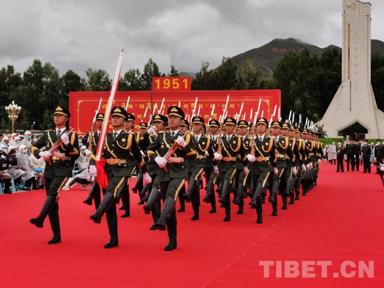 上午10時(shí),齊扎拉宣布大會開始。全場起立,奏唱國歌,鮮艷的五星紅旗在布達(dá)拉宮廣場冉冉升起。在熱烈的掌聲中,尤權(quán)宣讀了中共中央、全國人大常委會、國務(wù)院、全國政協(xié)、中央軍委關(guān)于慶祝西藏和平解放70周年的賀電。