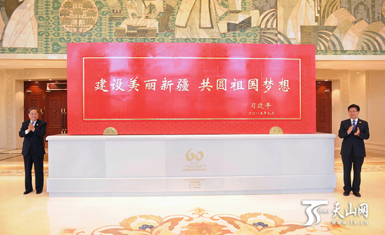 2015年9月25日,新疆維吾爾自治區(qū)成立60周年。中央代表團向新疆維吾爾自治區(qū)贈送了習近平總書記題詞“建設(shè)美麗新疆 共圓祖國夢想”的賀匾等紀念品。據(jù)媒體報道,“賀匾蔚為大觀,高3.1米、寬6米,以鮮艷的中國紅為底色,正面是貼金的習近平總書記題詞‘建設(shè)美麗新疆 共圓祖國夢想’,背面是維吾爾、哈薩克、蒙古、柯爾克孜四種少數(shù)民族文字對習近平總書記題詞的譯文。匾額內(nèi)圈回紋、外圈水紋,回紋寓意連綿不斷、吉利永長,象征各民族團結(jié)和睦、共同繁榮;水紋代表中華民族的母親河黃河和新疆人民的母親河塔里木河源遠流長,各族人民生生不息。”