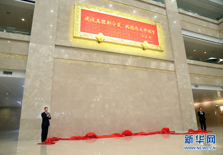 2018年9月19日,中共中央政治局常委、全國政協(xié)主席、中央代表團團長汪洋率中央代表團出席向?qū)幭幕刈遄灾螀^(qū)贈送紀念品儀式。這是汪洋和時任寧夏回族自治區(qū)黨委書記、人大常委會主任石泰峰一同為習近平總書記題詞賀匾揭幕。攝影:新華社記者 劉衛(wèi)兵