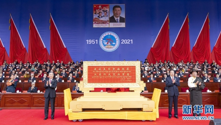 2021年8月19日,西藏自治區(qū)和平解放70周年。中共中央政治局常委、全國政協(xié)主席、中央代表團團長汪洋向西藏自治區(qū)贈送了中共中央總書記、國家主席、中央軍委主席習近平題詞的“建設(shè)美麗幸福西藏 共圓偉大復(fù)興夢想”賀匾等紀念品。