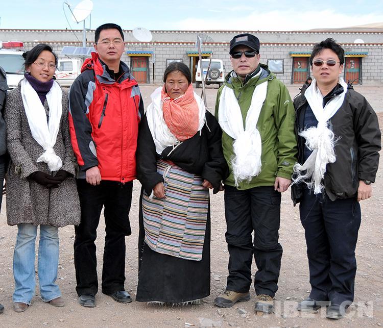 圖為中國(guó)石化第五批援藏干部、班戈縣副書(shū)記陳志清(左二)和常務(wù)副縣長(zhǎng)潘峰(右一)專(zhuān)程到班戈縣新吉鄉(xiāng)接脖子下長(zhǎng)著巨大腫瘤的牧女斯求卓瑪進(jìn)京治病時(shí),在鄉(xiāng)政府一同合影留念(王普2010年3月26日攝)