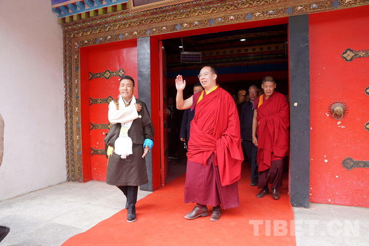 紀念館外,聞訊而來的信教群眾手捧哈達,迎候班禪并恭?!霸鞯吕铡?。班禪在走進紀念館前后,揮手向群眾回以祝福。