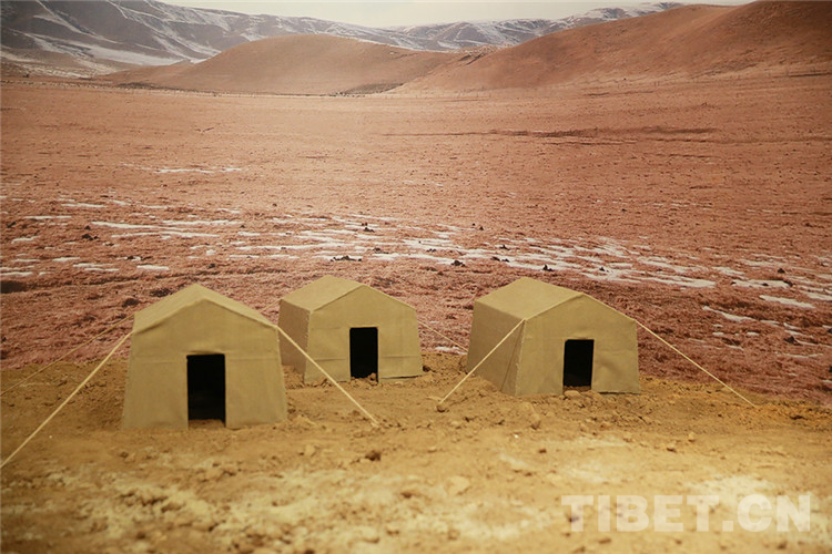 展廳內(nèi)三頂帳篷的模型,模擬了當年金銀灘草原上的場景。