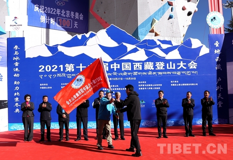 圖為國家體育總局登山運動管理中心副主任、中國登山協(xié)會副主席、中國登山隊隊長王勇峰為2021第十九屆中國西藏登山大會授旗 攝影:賈華加