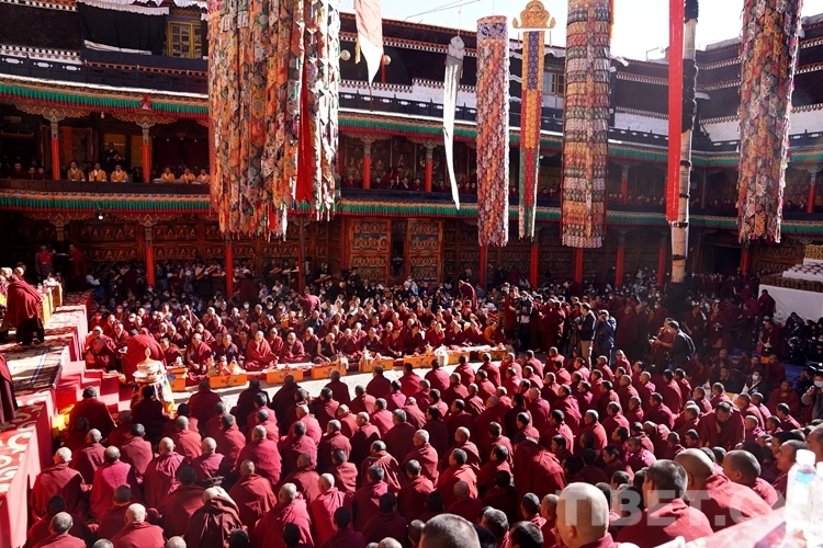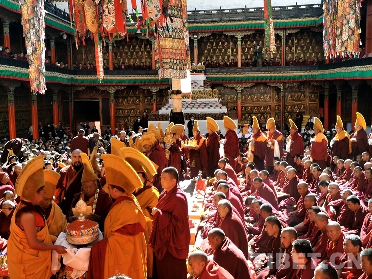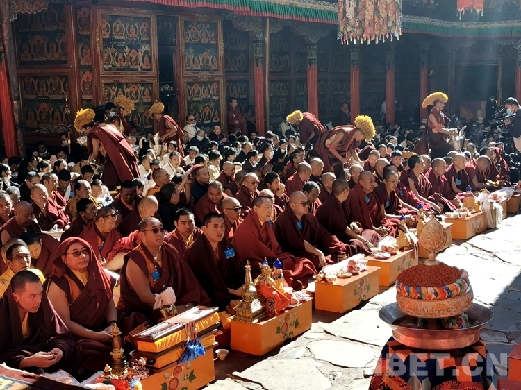 上午10時,隨著法號響起,領經(jīng)師領經(jīng)下僧眾開始集體誦經(jīng),班禪由手持香爐和吹嗩吶僧人引路來到扎什倫布寺多加大院。慶祝儀式上,扎什倫布寺高僧活佛、各寺廟僧尼代表及班禪親屬依次敬獻曼扎、禮品。同時,扎什倫布寺僧人在會場上以辯經(jīng)、跳“卡爾”舞等方式祝賀,并向現(xiàn)場信教群眾發(fā)放酥油茶、人參果、八寶飯等,共沾法喜。場面恢宏,恭敬威儀。
