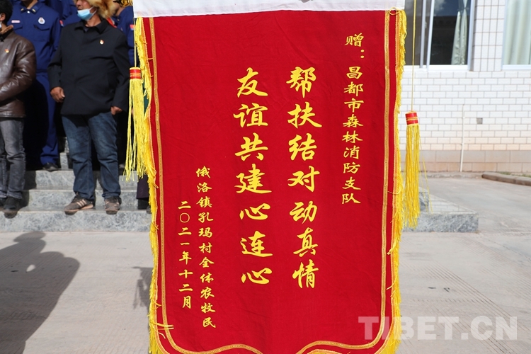 圖為孔瑪村向昌都市森林消防支隊獻(xiàn)上錦旗