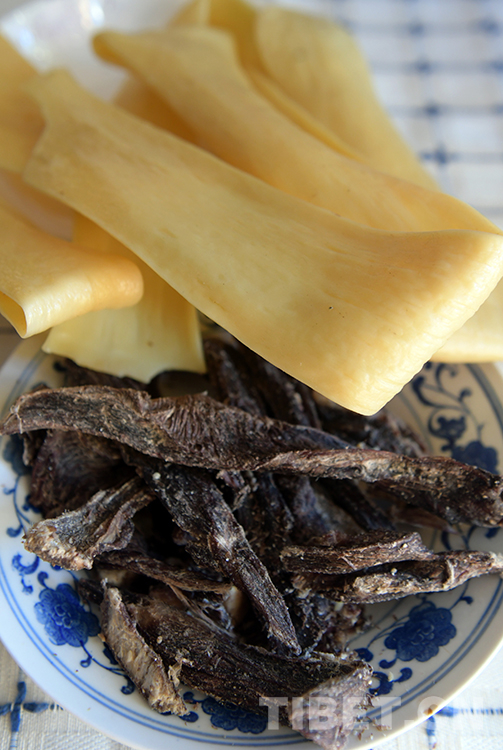 在藏北,常見的傳統(tǒng)風(fēng)干牦牛肉是不加任何佐料的,為的是讓肉保持最純粹的原味。每年進(jìn)入11月底,藏北已是天寒地凍,牧民們先將新鮮牦牛肉切成條型狀,然后掛在通風(fēng)處晾起來,使之冰凍風(fēng)干,自然脫去水分。第二年3月后取下生吃即可,味道十分鮮美。