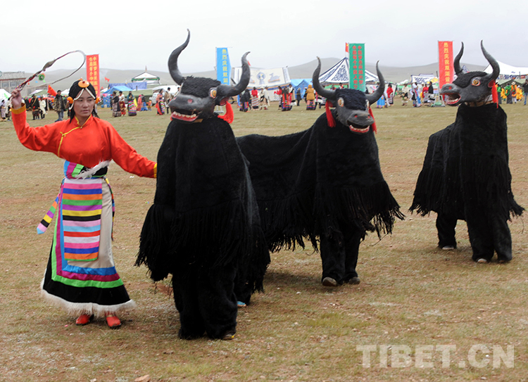 這是在那曲地區(qū)雙湖特別區(qū)(現(xiàn)那曲市雙湖縣)“撤區(qū)建縣”慶?;顒由媳硌莸摹瓣笈!蔽瑁ㄌ普倜?013年7月26日攝)
