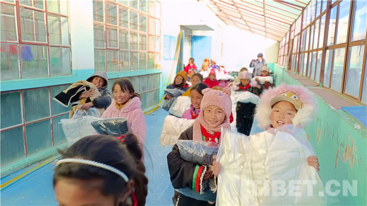 圖為向古姆鄉(xiāng)小學捐贈羽絨服