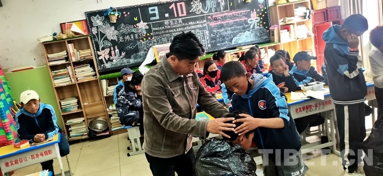 圖為薩迦縣中學(xué)理發(fā)社學(xué)生在老師指導(dǎo)下給其他學(xué)生剪頭發(fā)