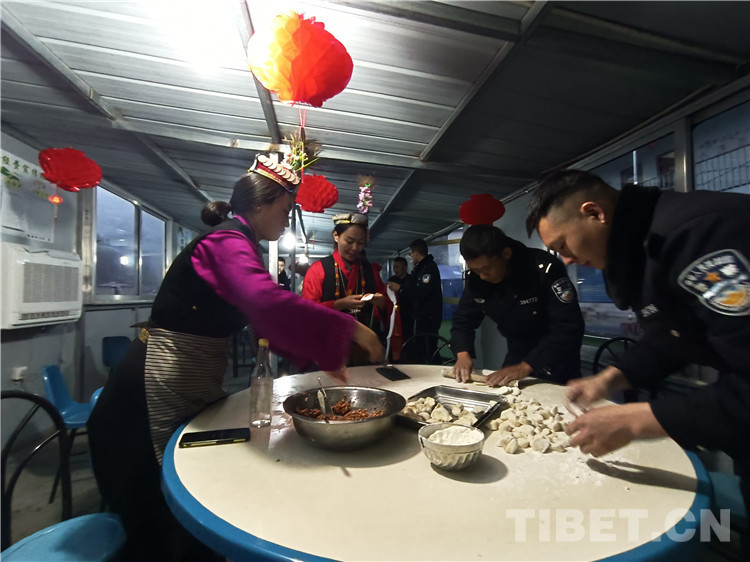 “阿久(藏語音譯:大叔),包餃子得講究手法,你要把餡放皮中央?!泵窬悋七呏v解邊演示,一個個餃子范本整整齊齊擺在托盤上。香腸、臘肉、餃子、羊肉、雞湯、糌粑、火鍋.....一桌藏漢式的年夜飯準(zhǔn)備完畢,大家圍坐在圓桌旁,舉杯共祝新春,濃濃的年味兒在夏爾巴第一村溢出,教導(dǎo)員康林感嘆道:“雖然春節(jié)不能回家,但是我們就是一個大家,祝大家新年快樂,扎西德勒!”