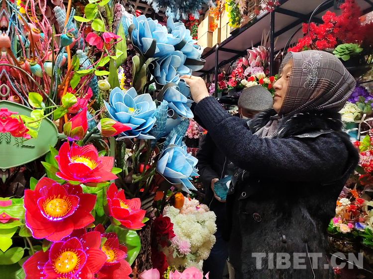 “我家店里客人挺多的,尤其這幾天,首先是因?yàn)槲覀兊幕ǚN齊全,應(yīng)有盡有,價(jià)格也實(shí)惠,其次我們之間能進(jìn)行簡單的溝通,我會一些日常簡單的藏語,他們也會說一些漢語。所以挺受大家歡迎?!蹦履不ǚ坷习迥擦岣吲d地說。
