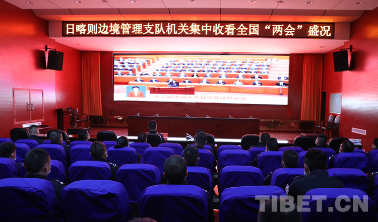圖為日喀則邊境管理支隊機(jī)關(guān)民警收看兩會