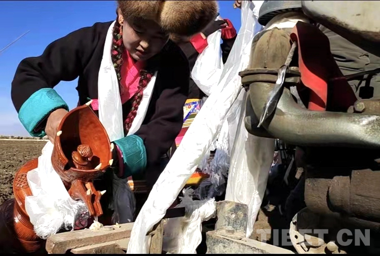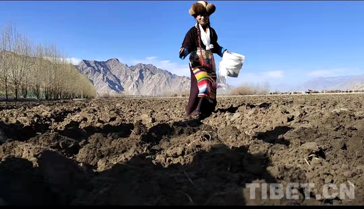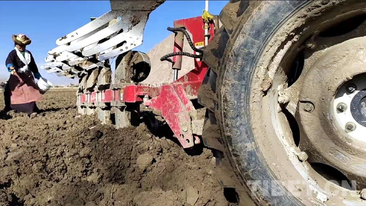 在雪水浸潤(rùn)過的肥沃土地上,深耕機(jī)車輪翻滾而過,駛過的土地上翻起深色的泥土,婦女們跟在后面播撒青稞良種。現(xiàn)場(chǎng)一片轟鳴,熱鬧無比,廣袤、肥沃的土地上播種下了春天的希望。