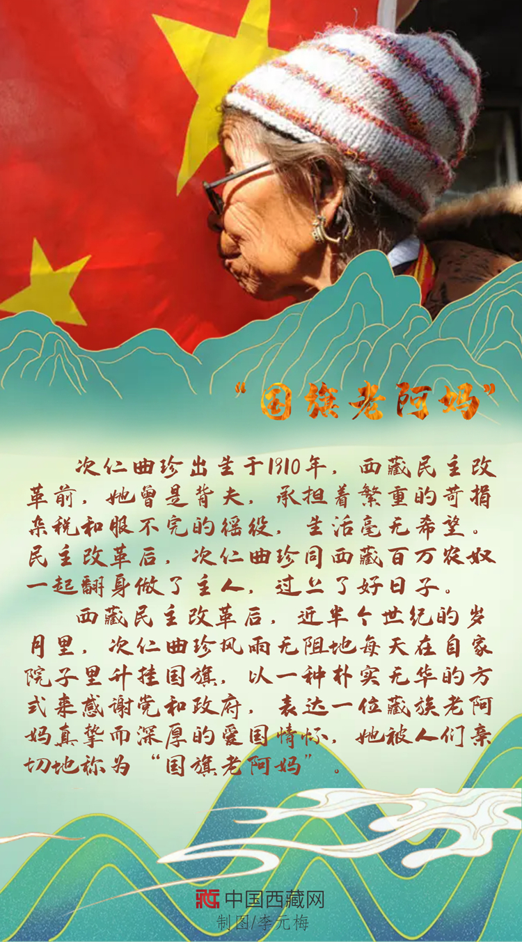 西藏民主改革后,次仁曲珍在自家院子里升起國(guó)旗,這一升就是近半個(gè)世紀(jì),一天不落,風(fēng)雨無(wú)阻。只有經(jīng)歷過(guò)舊西藏的人才知道新西藏的可貴,翻身成為國(guó)家主人的“國(guó)旗老阿媽”,以上萬(wàn)天堅(jiān)持不渝的行動(dòng)表達(dá)著自己樸素的愛(ài)國(guó)情懷。