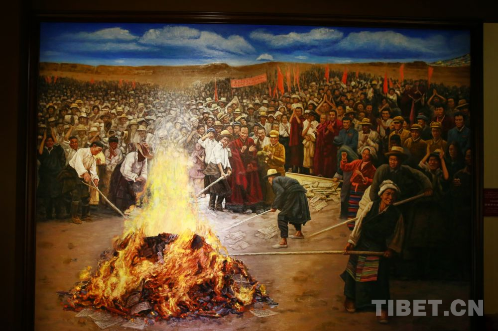 1959年3月,西藏開(kāi)始實(shí)施民主改革,圖為達(dá)孜縣翻身農(nóng)奴正在焚燒契約和債券文書(shū) 翻拍:許娜
