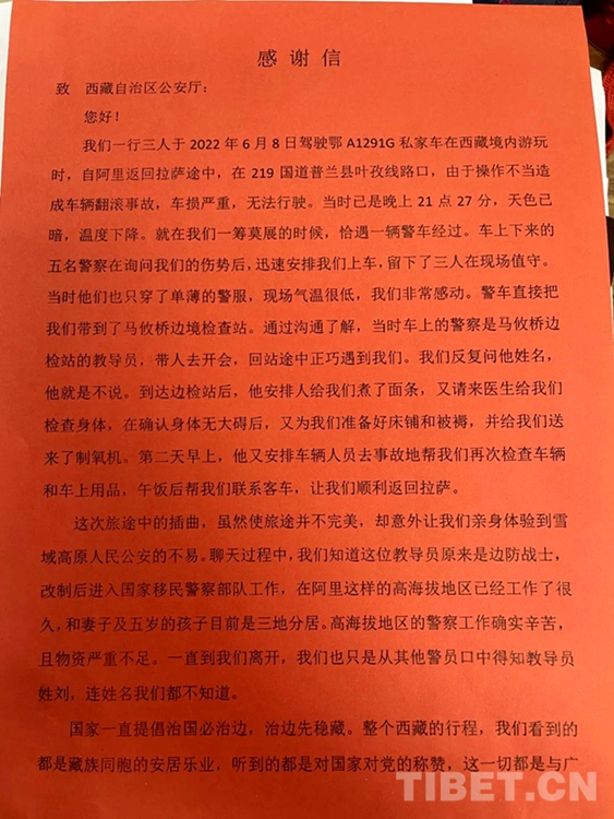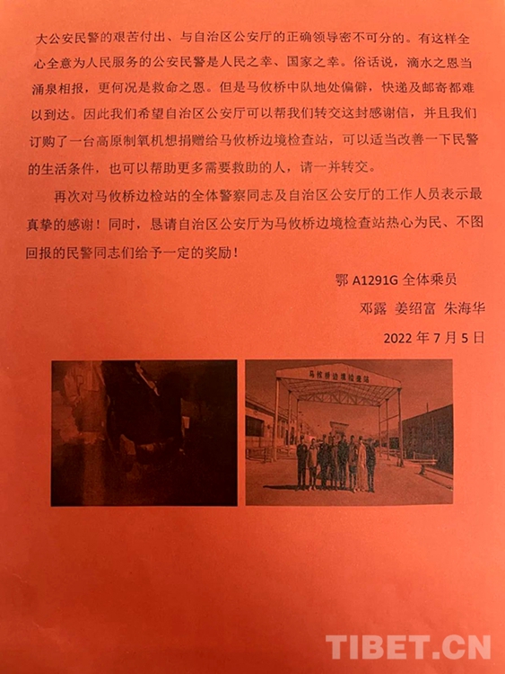中國(guó)西藏網(wǎng)訊 近日,西藏自治區(qū)阿里邊境管理支隊(duì)馬攸橋邊境檢查站(以下簡(jiǎn)稱:馬攸橋邊境檢查站)收到了一份署名為“鄂A1291G全體乘員”的包裹,里面包含了一面錦旗,一封感謝信,還有一份特別的禮物。