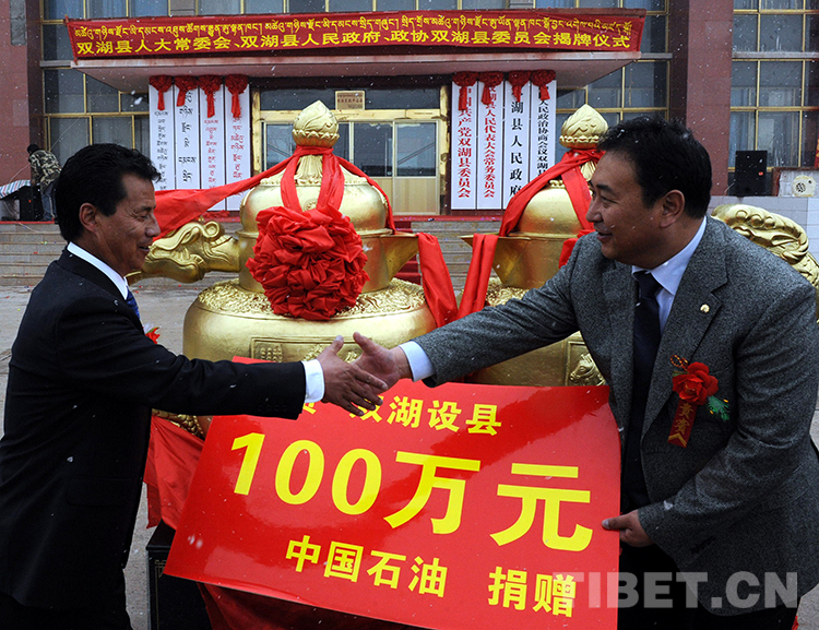 這是對口援助單位的中國石油為雙湖設(shè)縣捐贈100萬元。經(jīng)國務(wù)院批準(zhǔn),2013年7月26日,雙湖特別區(qū)“撤區(qū)建縣”正式掛牌(唐召明2013年7月26日攝)