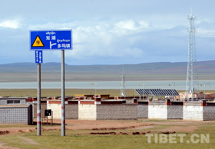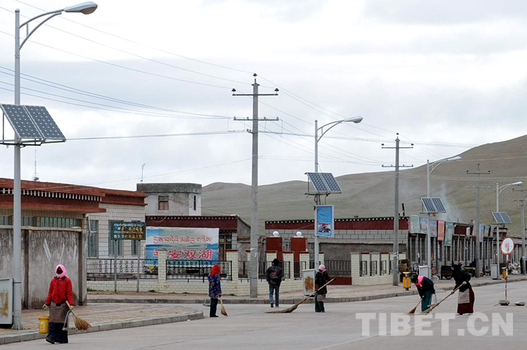 當(dāng)時,經(jīng)過創(chuàng)業(yè)者三十多年的開發(fā)建設(shè),雙湖鎮(zhèn)中心已有了一條筆直寬敞的水泥路,道路兩旁還有漂亮的太陽能路燈和垃圾箱,黨政辦公樓、敬老院、職工活動中心、幼兒園、普若崗日賓館、加油站等新建筑拔地而起,并建起了大型的太陽能光伏電站。